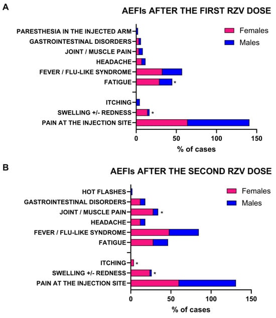 Incidence of adverse events following immunization (AEFI) stratified by sex after first and second recombinant zoster vaccine (RZV). *, p value < 0.05.