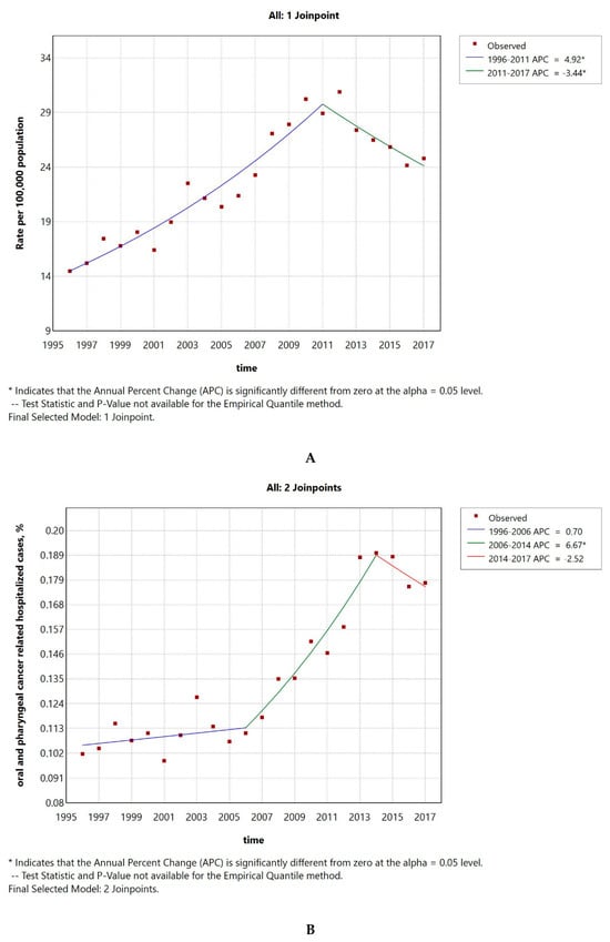 The hospitalization rate ranged from a minimum of 14 per 100,000 in 1996 to a maximum of 31, while in 2017 it went down to 25. The AAPC was 2.46 (CI 1.86–3) (Figure 2A). The number of LOPC cancer cases compared to the total number of hospitalizations is shown in Figure 2B. The AAPC was 2.46 (CI 1.84–3.06). Both the AAPC values were significantly different from zero at the alpha = 0.05 level.