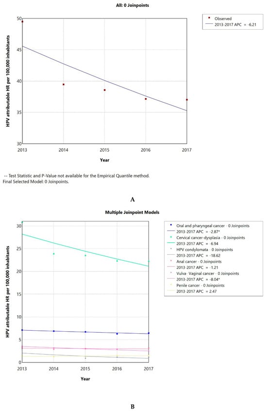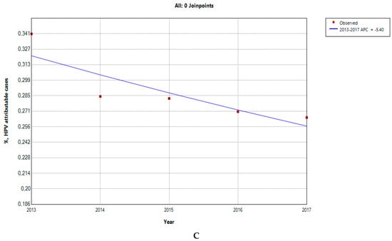 The HPV-attributable hospitalization rate per 100,000 people in Greece has decreased over time, from 50 cases/100,000 inhabitants in 2013 to 37 in 2017. The AAPC was −6.21 (CI −15.92–4.49) (Figure 3A), but it was not significantly different from zero at the alpha = 0.05 level. As seen in Figure 3B, this decline could be primarily linked to a significant reduction in cervical cancer or cervical dysplasia cases. The AAPC for HPV-related conditions is shown in Table 1; all conditions demonstrated a declining trend, except for penile cancer. The AAPC was significantly different from 0, only in the case of LOPC cancer and vulva–vagina cancer. Additionally, the percentage of HPV-related cases to the total number of hospitalizations demonstrated a decreasing tendency with an AAPC of −5.4 (CI −11.05–0.53), which was not significantly different from zero at the alpha = 0.05 level (Figure 3C).