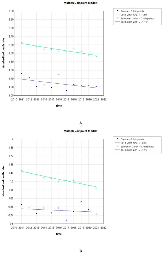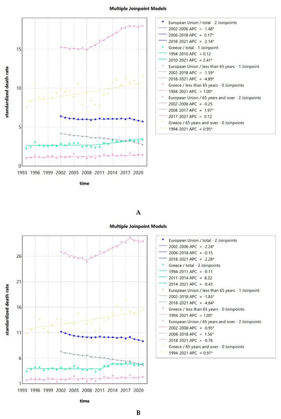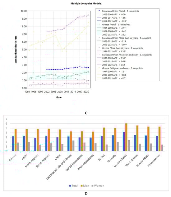 The trends in SDR for women are seen in Figure 5C. The AAPC for Greece was 1.78 (0.86–2.97) for the total female population, 1.36 (0.06–2.65) for women less than 65 years old, and 1.52 (0.66–2.66) for women 65 years of age and older. The AAPC for the whole EU was 0.49 (0.32–0.63) for the total female population, −1.12 (−1.31–−0.89) for women less than 65 years old, and 1.34 (1.21–1.45) for women 65 years of age and older. All the values were significantly different from zero at the alpha = 0.05 level.