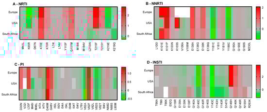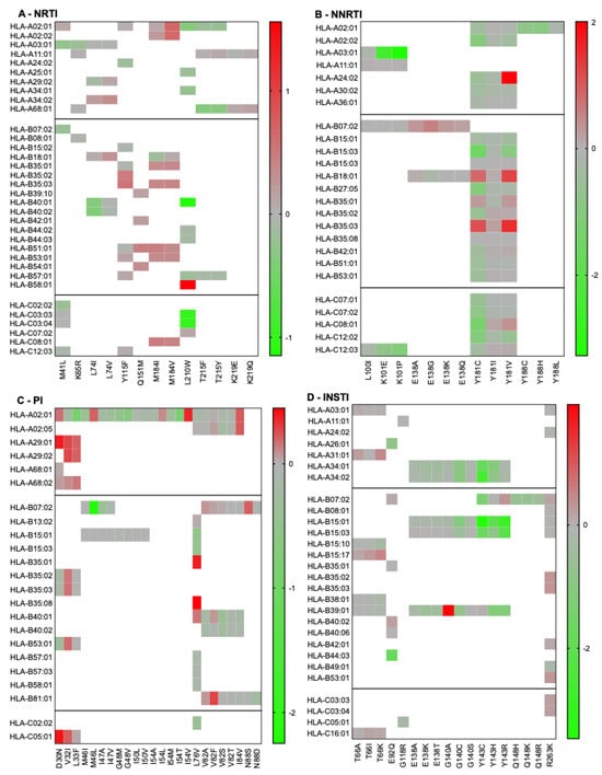Given that a large number of people with HIV live in South Africa, where treatment is frequently available, and the dominant HIV-1 subtype is C, we performed similar analyses with this subtype and HLA alleles frequently found in the South African population [41]. Figure 3 illustrates the heatmaps of RAMs/HLA permissiveness.