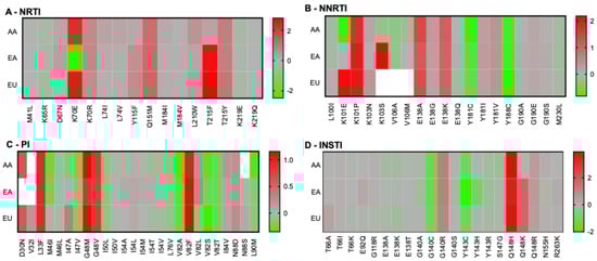 Population-based permissiveness and non-permissiveness heatmaps of HIV-1 subtype B RAMs in the AA, EA, and EU populations. Average log-transformed fold changes in binding are color-coded. Red indicates non-permissiveness, green permissiveness, and grey neutrality. White indicates no binding. Peptides that were neither weak nor strong binders were excluded from downstream analyses, explaining why not all RAMs are represented in this figure.