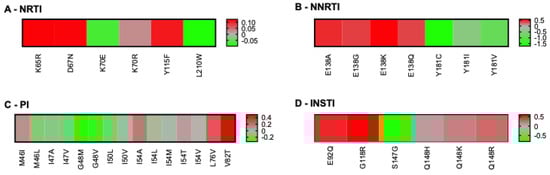 Heatmaps of RAMs/HLA-B57:01 permissiveness with HIV-1 subtype B. Log-transformed fold changes in binding are color-coded. Red indicates non-permissiveness, green permissiveness, and grey neutrality. RAMs that were neither weak nor strong binders of HLA-B57:01 are not represented in this figure, for example L74V and M184I/V. All RAMs were used for this analysis (none excluded), because no RAM is exclusively associated with ABC, which is itself not recommended for people with HLA-B57:01. Similarly, no drug class was excluded from this analysis, as HLA-B57:01-positive persons are eligible to receive any treatment combination, as long as it does not include ABC.