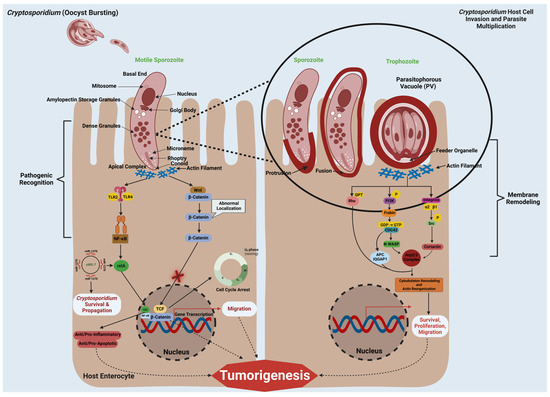 Cryptosporidium uses host cell signaling pathways to support its survival and replication (Figure 2). It activates pathways like PI3K, Src, Cdc42, and Rho GTPases upon contacting epithelial cells, disrupting the cell barrier and promoting actin filament polymerization. This enables the formation of the parasitophorous vacuole (PV), essential for its survival [20,21,23,76]. Additionally, Cryptosporidium also triggers NF-κB signaling via Toll-like receptors (TLR2 and TLR4), inducing inflammatory cytokines and anti-apoptotic proteins to prevent host cell death and sustain replication [22,77]. Moreover, manipulation of Wnt signaling pathway impairs β-catenin localization and interferes with cell cycle regulation and adhesion, potentially contributing to oncogenesis [24]. Host miRNAs like miR-27b and ciRS-7 may also change during infection by impacting both NF-kB pathway activity as well as immune responses. These modifications support parasite survival by altering gene expression regulation [26,78], while at the same time encouraging tumorigenesis via gene regulation mechanisms that influence gene regulation [26,78].