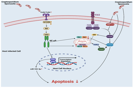 Cryptosporidium exerts control over both pro-apoptotic and anti-apoptotic gene expression, helping sustain cell survival during infection. For example, anti-apoptotic genes like Bcl-2, Bcl-xL and survivin become upregulated upon infection. These proteins stabilize mitochondrial membranes and prevent cytochrome-c release which would otherwise trigger activation of the apoptotic pathway [32,33]. In contrast, Cryptosporidium effectively suppresses pro-apoptotic genes such as Bax and Bak, thus avoiding mitochondrial membrane permeabilization and subsequent cell death, aiding its ability to avoid immune responses while remaining chronic [34,35]. Furthermore, Cryptosporidium modulates expression levels of two anti-apoptotic regulators known as cellular inhibitors of apoptosis (cIAP1 and cIAP2), blocking caspase activity to extend cell survival, thus increasing tumorigenic potential [35].