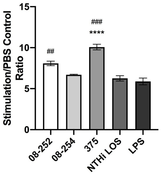 Cell surface expression of ICAM-1 in differentiated THP-1 cells stimulated with non-typeable H. influenzae (NTHi) clinical isolates 08-252 (n = 4), 08-254 (n = 3), and 375 (n = 3) at MOl 10, NTHi 375 LOS at 48 ng/mL (n = 3), or E. coli LPS at 100 ng/mL (n = 9) for 18 h as described in Methods (flow cytometry analysis). **** p < 0.0001 statistical significance between treatments and LOS; ## p < 0.01 and ### p < 0.001, statistical significance between treatments and LPS; MOI, multiplicity of infection; stimulation/PBS control ratio, Mean ± SD.