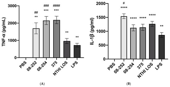 Cytokine release from differentiated THP-1 cells stimulated with non-typeable H. influenzae (NTHi) clinical isolates 08-252 (n = 4), 08-254 (n = 8), and 375 (n = 7) at MOl 10, NTHi LOS at 48 ng/mL (n = 3), or E. coli LPS at 100 ng/mL (n = 7) for 18 h as described in Methods. Concentrations of TNF-α (A) and IL-1β (B) were measured by ELISA (pg/mL). Data represent mean cytokine concentrations ± SEM. ** p < 0.01, *** p < 0.001, and **** p < 0.0001, statistical significance between treatments and PBS; # p < 0.05, ## p < 0.1, ### p < 0.001, and #### p < 0.0001, between bacterial stimulation and LPS.