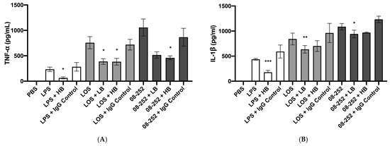 Cytokine release from differentiated THP-1 cells stimulated with non-typeable H. influenzae (NTHi) clinical isolate 08-252 at MOl 1, E. coli LPS, or NTHi LOS at 10 ng/mL for 18 h following inhibition of TLR4 as described in Methods. Concentrations of TNF-α (A) and IL-1β (B) were measured by ELISA (pg/mL). THP-1 cells were pre-treated with 5 (LB) or 10 μg/mL (HB) mouse anti-TLR4 IgG 1 h prior to stimulation. IgG Control, mouse control IgG1 at concentration of 10 μg/mL; * p < 0.05, ** p < 0.01, and *** p < 0.001, statistical significance between treatments and IgG control. Data represent mean cytokine concentrations ± SEM (n = 4 independent experiments).