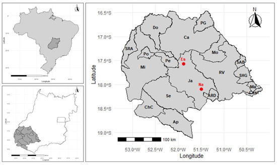 The study site was the southwestern microregion of Goiás, located on the central plateau of Brazil, with a territorial extension of 56,111.874 km2 and an estimated population of 536,973. The region includes the municipalities of Aparecida do Rio Doce, Aporé, Caiapônia, Castelândia, Chapadão do Céu, Doverlândia, Jataí (and its two districts, Estância and Naveslândia), Maurilândia, Mineiros, Montividiu, Palestina de Goiás, Perolândia, Portelândia, Rio Verde, Santa Helena, Santa Rita do Araguaia, Santo Antônio da Barra, and Serranópolis (Figure 1) [16,17]. The climate is tropical semi-humid, with an average annual temperature and precipitation of 20–28 °C and 2300 mm, respectively [16,17].