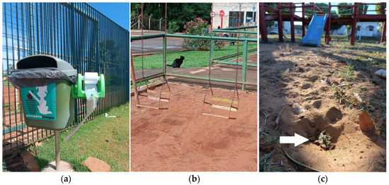 In a previous study, the use of a collar and the owner’s guidance reduced the presence of dog fecal samples in urban parks in the city of Calgary [4]. This strategy could serve as a preventive measure to reduce environmental contamination, alongside proper feces removal and disposal. Interestingly, in the present study, only one area (1/117) had a policy intended to raise awareness regarding the disposal of animal feces. Furthermore, few of the studied areas had physical containment in recreational areas, such as sand courts and playgrounds, to reduce access to stray animals, minimizing the risk of environmental contamination (Figure 2). There are no government notices for feces to be collected and thrown in the trash; consequently, no penalties are applied to pet owners.