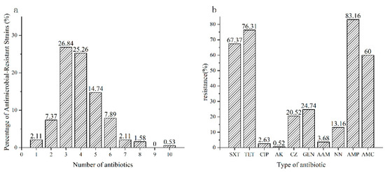 | SXT | TET | CIP | AK | CZ | GEN | AAM | NN | AMP | AMC | ≥1 | ≥3 | ≥5 | ≥7 | |