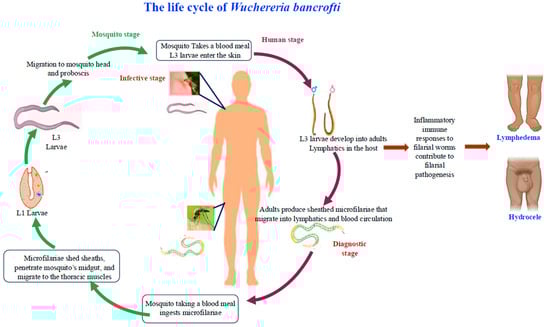 - Zulfiqar, H.; Malik, A. Bancroftian Filariasis. In StatPearls [Internet]; StatPearls Publishing: Treasure Island, FL, USA, 2023. Available online: https://www.ncbi.nlm.nih.gov/books/NBK547682/ (accessed on 5 September 2024).