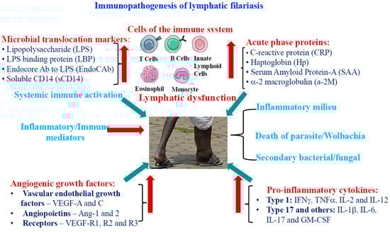 - Babu, S.; Bhat, S.Q.; Pavan Kumar, N.; Lipira, A.B.; Kumar, S.; Karthik, C.; Kumaraswami, V.; Nutman, T.B. Filarial lymphedema is characterized by antigen-specific Th1 and th17 proinflammatory responses and a lack of regulatory T cells. PLoS Negl. Trop. Dis. 2009, 3, e420. [Google Scholar] [CrossRef] [PubMed]