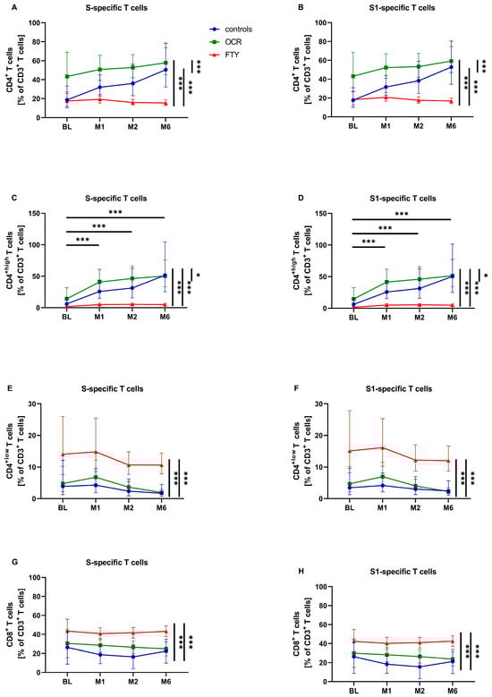 Impact of first SARS-CoV-2 mRNA vaccination on selected spike-specific (S) T-cell subsets and T-cell subsets specific for the S1 domain of the spike protein (S1) in the control group (controls, n = 17) compared to the fingolimod (FTY, n = 15) and the ocrelizumab (OCR, n = 15) groups. Relative percentages of T-cell subsets are shown at baseline (BL), one-month follow-up (M1), two-month follow-up (M2), and six-month follow-up (M6). Means with 95% confidence intervals are presented for relative percentages of CD4+ T cells (A,B), CD4+high T cells (C,D), CD4+low T cells (E,F), and CD8+ T cells (G,H). Asterisks indicate a statistically significant difference in percentages of relative T-cell subsets between selected time points or groups (* p < 0.05, *** p < 0.001).
