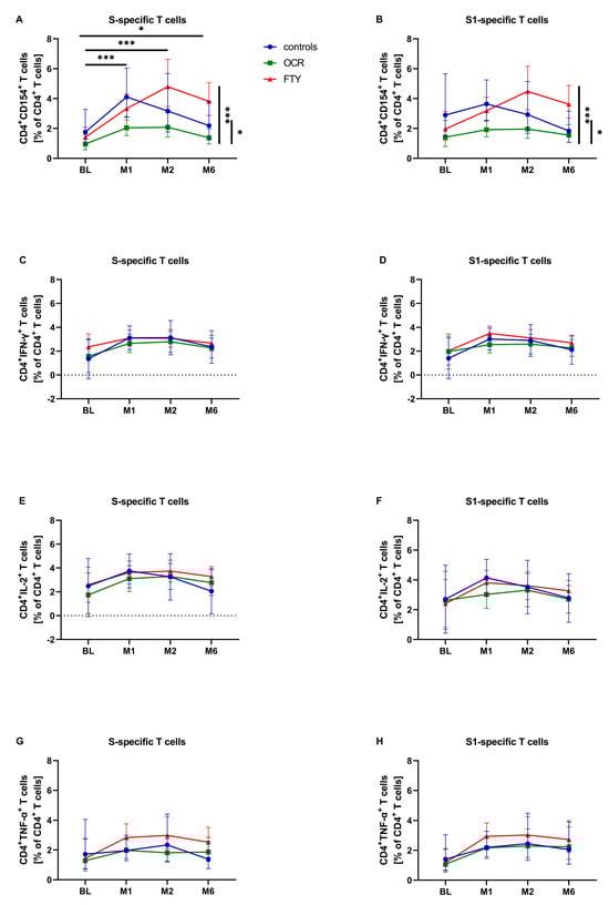 Impact of first SARS-CoV-2 mRNA vaccination on selected spike-specific (S) T-cell subsets and T-cell subsets specific for the S1 domain of the spike protein (S1) in the control group (controls, n = 17) compared to the fingolimod (FTY, n = 15) and the ocrelizumab (OCR, n = 15) groups. Relative percentages of T-cell subsets are shown at baseline (BL), one-month follow-up (M1), two-month follow-up (M2), and six-month follow-up (M6). Means with 95% confidence intervals are presented for relative percentages of CD4+CD154+ T cells (A,B), CD4+IFN-γ+ T cells (C,D), CD4+IL-2+ T cells (E,F), and CD4+TNF-α+ T cells (G,H). Asterisks indicate a statistically significant difference in relative percentages of T-cell subsets between selected time points or groups (* p < 0.05, *** p < 0.001).