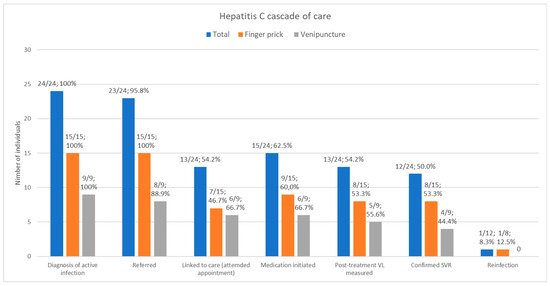 Twenty-four patients were diagnosed with active HCV infection, twenty-three were referred to a specialist (23/24; 95.8%), but only thirteen attended the appointment (13/24; 54.2%). Out of the ten patients who were not initially linked to treatment, two were subsequently initiated on therapy. One patient started treatment 1.5 years later following an emergency room admission due to spontaneous bacterial peritonitis (SBP) as a complication of liver cirrhosis by HCV that required a liver transplant. The other one was linked to treatment 2.6 years after at an HIV care clinic. All patients linked to care were treated (15/24; 62.5%). The end treatment response was 100% (two patients were not tested because they did not attend the visit), and sustained virological response (SVR) was also 100% (three patients were not tested because they had not attended the visit), as shown in Figure 1.