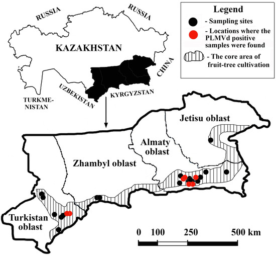 The southeastern Kazakhstan region accounts for more than 90% of the stone fruit crop production [12]. Peaches are hardly grown in the areas of the country located to the north due to the severe cold winters. For this reason, samples were collected in the southeast to monitor the PLMVd.