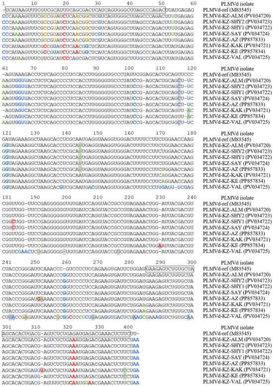 The alignment of cloned whole-genome sequences of the PLMVd from southeastern Kazakhstan. The PLMVd reference sequence (GenBank: M83545) [19] is shown for comparative purposes. Nucleotides involved in the formation of plus and minus hammerhead structures are boxed [20]. Nucleotide variations identified only in Kazakhstani isolates are indicated with gray boxes. Nucleotide variations that disrupt the basic structures P1–P11 of the PLMVd are highlighted in red. Nucleotide variations that restore or enhance the basic structures of the PLMVd are highlighted in blue. Nucleotide variations that do not affect the formation of secondary structures of the PLMVd are highlighted in green. Nucleotide variations that disrupt the basic structures of the PLMVd but contribute to the formation of other secondary structures are highlighted in light brown.