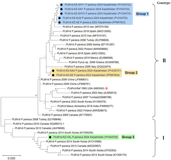 Representatives of Group 1 PLMVd were identified in four districts of the Almaty and Turkistan oblasts, while representatives of the other two groups were identified only within the city of Almaty. Isolates from Group 1 were genetically closest to the isolates from Iran (GenBank: MG788245, MF574157, MF574159) and Poland (GenBank: MW928681). Representatives of Group 2 were evolutionarily most related to the isolates from Spain (GenBank: AJ005316, AJ005317, MK212068). The only representative of Group 3 (GenBank: PV034725) was evolutionarily related to isolates from South Korea (GenBank: KY355291, KY355294, KY355296).