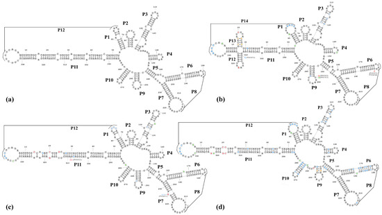 Various variants of viroids can only survive if the changes in their nucleotide sequences do not disrupt the formation of functionally significant secondary and tertiary structures [22,23]. We analyzed the relationship between nucleotide variations and the predicted RNA secondary structures. The most stable secondary structures (with the lowest free energies) were predicted for all the sequenced PLMVd variants using the RNA-structure online server of Mathews Lab Home (available at https://rna.urmc.rochester.edu). The PLMVd reference sequence (GenBank: M83545) [19] was taken for comparative purposes. For a better description of secondary structure, the helices (P1–P14) of the PLMVd secondary structures were numbered as per Perreault et al. [24]. The results of the analysis are presented in Figure 4.