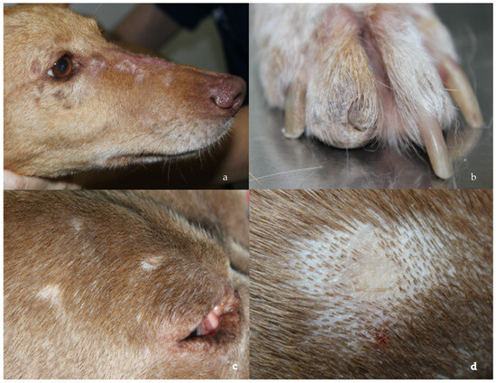 In the database between 2013 and 2024, six dogs were included in the study, and the breeds present were greyhound, Chihuahua, whippet, American bully, hound and mixed breed. The median age at presentation was 6 years [2–8 years], and the dogs were mostly males (n = 4). In the physical examination, three dogs presented mild generalized lymphadenomegaly, and the skin lesions were multifocal alopecia with atrophic skin with hyper- or hypopigmentation (Figure 1a,c,d) (5/6), ulcers (3/6) and onychodystrophy (Figure 1b) (2/6) (Table S1). These lesions were limited to the face, trunk and to the extremities (including nails) and developed at the time of diagnosis of leishmaniosis (5/6) or during the first month after diagnosis and during treatment of leishmaniosis (1/6).