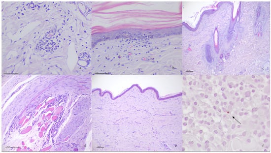 Photomicrographs of skin sections of ischemic dermatopathy with H&E: (a) lymphoplasmacytic perivascular to interstitial dermatitis, centered around dermal capillaries; (b) interface dermatitis composed of cell-poor infiltrates at the dermo–epithelial junction with the presence of intraepithelial lymphocytes in the epidermis; (c) follicular atrophy; (d) myositis composed of lymphoplasmacytic infiltrate between the muscle fibers; (e) dermal fibrosis and (f) immune-positive Leishmania spp. amastigote within a macrophage detected through immunochemistry (arrow).