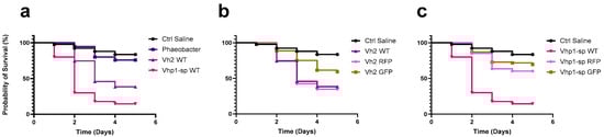 Comparisons between the groups treated with Vibrio harveyi WT strains and the saline-treated negative control revealed that both strains caused statistically significant increases in mortality compared to the saline control (Figure 3a). Further comparisons of the modified strains were made against both the saline-treated negative control and their respective wild-type (WT) strains (Figure 3b,c).
