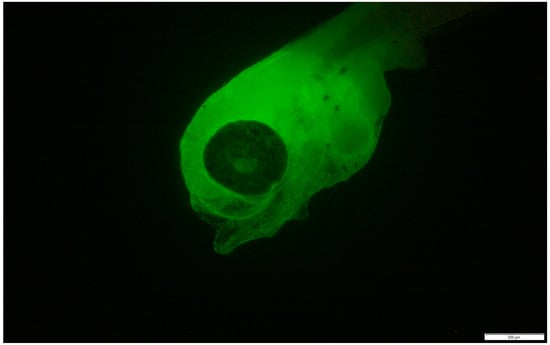 The transconjugants of both Vibrio harveyi strains were readily detected and visualized in the colonized tissues of gilthead seabream larvae. In most cases, bacteria were observed within 1–2 days post-infection, predominantly localized in the eyes, on the skin near the tail, around the yolk sac, and, at later stages, in the developing intestine (Figure 4). Dead larvae appeared fully covered by bacteria (Figure 5).