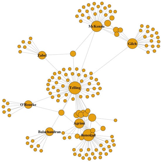 Representation of a social network of chronic wasting disease (CWD) strain researchers showing the connections between senior authors and their collaborators. Each circle represents a researcher. The size of the circle indicates the significance (based on publication numbers and collaboratives) of that researcher in this CWD strain community. The link between the two circles indicates collaboration between the two researchers.
