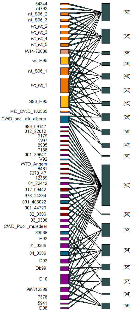 To visualize the distribution between CWD strain publications and the infected isolate used, we built a bipartite network (Figure 2) by using plotweb and visweb function in bipartite package in Program R (v2.18; [83]). The lower level indicated the known CWD infected isolates, and the top level indicated the publications that have been applied in that specific isolate. This bipartite representation allowed for identification of the number of times an individual infected isolate had been used in CWD strain research and the number of isolates used in a specific paper.