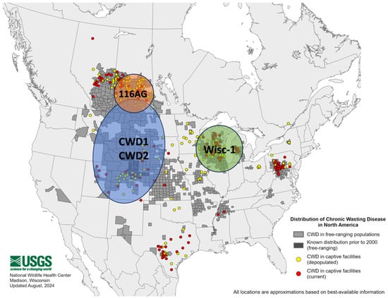 - [USGS], United States Geological Survey. Expanding Distribution of Chronic Wasting Disease. United States Geological Survey [USGS]. Available online: https://www.usgs.gov/centers/nwhc/science/expanding-distribution-chronic-wasting-disease?qt-science_center_objects=0#qt-science_center_objects (accessed on 16 February 2024).