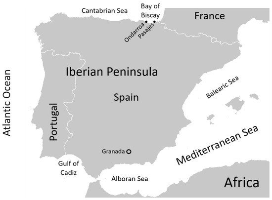Map of the Iberian Peninsula. The area of investigation showing ports where Trisopterus luscus samples were landed (•) and the fish markets sampled (o).