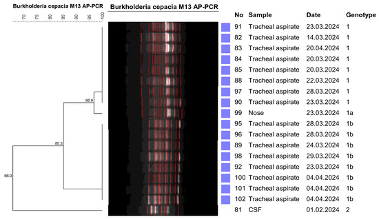 AP-PCR analysis of the 18 Burkholderia cepacia isolates included in the study revealed two different genotypes. Of the 18 Burkholderia cepacia isolates, 17 were clonally identical and formed a single cluster, resulting in a dominant clustering rate of 94.4%. The clonally distinct isolate was a CSF sample, which was taken while the patient was hospitalized in a different hospital (Figure 2). No BCC isolate was subsequently detected in the hospital to which the patient from whom the CSF sample belonged was referred.