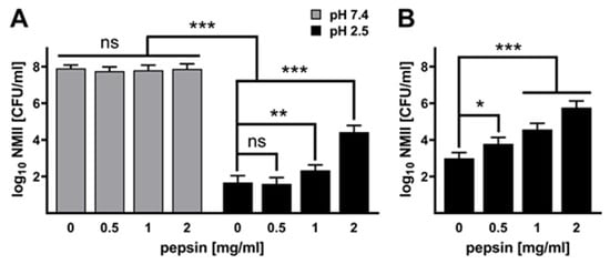 Influence of pepsin on the acid resistance of C. burnetii NMII. NMII (1 × 108 CFU/mL) were treated with the pepsin concentrations indicated at pH 2.5 for 2 h (A) and for 3 h (B). As a control, NMII were cultured in PBS at pH 7.4 for 2 h (A) with the pepsin concentrations indicated. The recovery rate of NMII was determined by CFU calculation on ACCM-2 agar plates. CFU values (log10 CFU) represent the means and standard errors of four independent experiments, each with two biological and three technical replicates. ns > 0.05, * p < 0.05, ** p < 0.01, *** p < 0.001.