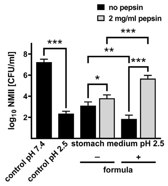 Influence of formula in combination with pepsin on survival of C. burnetii NMII. NMII (1 × 108 CFU/mL) were incubated for 2 h with stomach medium at pH 2.5 with or without 2 mg/mL pepsin. In addition, formula was either added or not. As controls, PBS at pH 2.5 and pH 7.4 was used. The recovery rate of NMII was determined by CFU calculation on ACCM-2 agar plates. CFU values (log10 CFU) represent the means and standard errors of four independent experiments, each with two biological and three technical replicates. * p < 0.05, ** p < 0.01, *** p < 0.001.