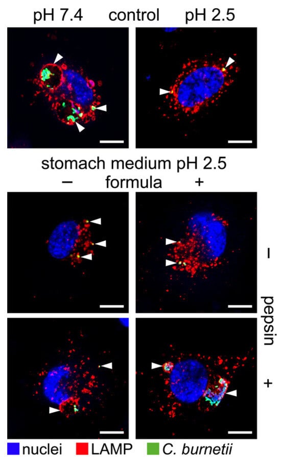 Influence of a simulated stomach passage on the infectivity of the C. burnetii NMII. Bacteria treated with either pepsin (20 mg/mL) and formula or not were used to infect endothelial EA.hy926 cells on coverslips with MOI 100. As controls, bacteria treated with PBS at pH 2.5 or pH 7.4 were used to infect EA.hy926 cells at MOI 100. The cells were fixed 48 h post-infection and stained for LAMP-1 (red), C. burnetii (green), and DNA (blue). Representative images are shown from three independent experiments. Arrows indicate C. burnetii-containing vacuoles. Each scale bar represents 10 μM.