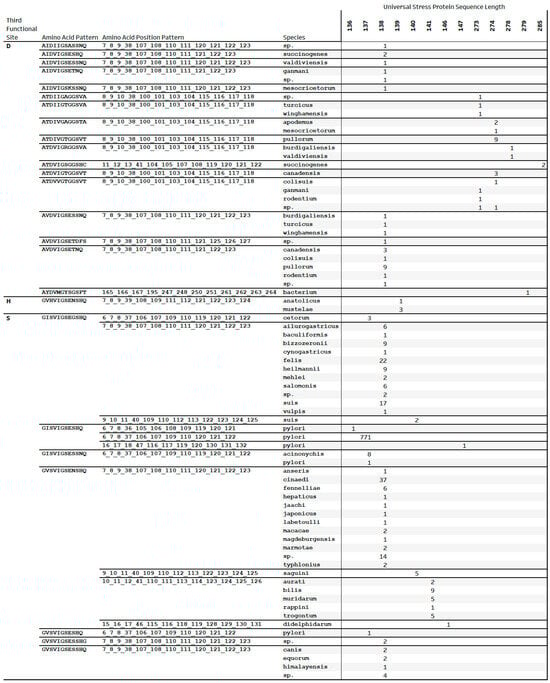 A use of our grouping approach is for identifying species with unique or identical functional sites patterns in Helicobacteraceae USP sequences. All the USPs with lengths 273 aa, 274 aa, 279 aa, and 285 aa have aspartate as residue in the third position. The 138 aa Helicobacteraceae USPs group into those with third position residue as aspartate (D) or serine (S). Among USP sequences with aspartate (D) in the third position of functional site patterns, the 273 aa of H. turcicus and H. winghamensis have an identical amino acid pattern of functional sites (ATDIIGTGGSVA). Other examples are (1) 273 aa USPs of H. apodemus and H. mesocricetorum with pattern ATDIVGAGGSTA; and (2) 278 aa USPs of H. burdiagaliensis and H. valdiviensis with pattern ATDVIGRGGSVA. The functional sites patterns of the 138 aa USP of H. valdiviensis is AIDVIGSESSNQ, which is distinct from AVDVIGSESSNQ from the 138 USPs of H. burdigaliensis, H. turcicus, and H. winghamensis. The only two 139 aa USPs with histidine (H) in the third position of functional site patterns were encoded in the genomes of H. anatolicus and three genomes of H. mustelae. The groupings by this approach are consistent with prior studies using other methods: H. turcicus and H. winghamensis []; H. apodemus and H. mesocricetorum []; H. burdigaliensis and H. valdiviensis []; and H. anatolicus and H. mustelae [].