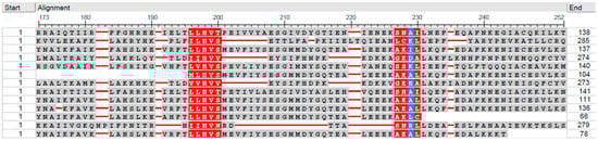 - Wang, J.; Chitsaz, F.; Derbyshire, M.K.; Gonzales, N.R.; Gwadz, M.; Lu, S.; Marchler, G.H.; Song, J.S.; Thanki, N.; Yamashita, R.A. The conserved domain database in 2023. Nucleic Acids Res. 2023, 51, D384–D388. [Google Scholar] [CrossRef]