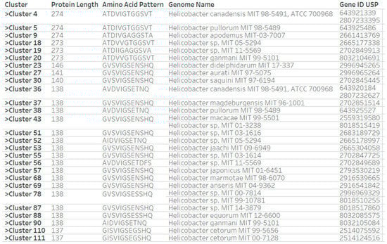 The clustering of the 1045 USP sequences into 183 clusters also allowed us to determine the count of USP sequence clusters per group of strains (strain group). A strain group has strains, which share features such as a genome sequencing project or publication. For example, H. pylori strains with “SA” as the first two letters of strain name were isolated in South Africa []. We present in Table 2 the count of universal stress protein sequences and corresponding count of sequence clusters for selected strain groups with isolates from Gambia, South Africa, China, and Malaysia. In addition, we designed a worksheet in Tableau to determine unique and shared clusters among USP sequences in a strain group. The visual design of the worksheet had the following order of the fields: cluster, protein length, amino acid pattern (functional sites), genome name, and IMG Gene ID for USP gene (Figure 3 for MIT strain group and Supplementary Figure S2 for H. pylori GAM strain group). The MIT strain group, which is typically a Helicobacter species other than H. pylori, had 24 strains with strain name having the MIT-XX-XXXX suffix, 27 USP sequence clusters, and 31 USP sequences (Figure 3). We also observed that the IMG genome names of four MIT strains (05-5293, 11-8110, 15-1451, and 16-1353) did not include the suffix MIT. Furthermore, the full scientific name for strain 15-1451 is now Helicobacter monodelphidis MIT 15-1451 [].