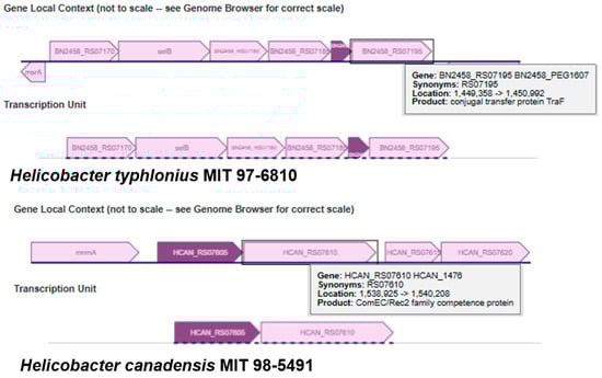 BioCyc diagrams of gene local context and transcription unit for genes for universal stress proteins adjacent to genes for proteins involved in DNA uptake. The universal stress protein (USP) gene image is darker than neighboring genes. The transcription unit indicates genes that could be in an operon. According to BioCyc Operons tab in the gene page, a dashed baseline indicates that there is no high-quality evidence to confirm the extent of this transcription unit. Top diagram: Gene encoding a 138 aa universal stress protein (USP) in the genome of Helicobacter typhlonius MIT 97-6810. Bottom diagram: Gene encoding a 274 aa USP in the genome of Helicobacter canadensis MIT 98-5491. Interactive diagrams can be accessed at the BioCyc website.