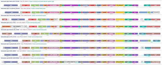 Genomic context is “information gleaned from the genes surrounding a gene of interest in the chromosome” []. The transcription direction, start and end coordinates, as well as functional annotations of genes surrounding a gene of interest are examples of genomic context information provided by genomic sequencing projects []. Additionally, an operon “is a collection of genes that are co-transcribed to form a single mRNA molecule in at least some set of biologically relevant conditions []”. Genes in bacterial genomes with similar function or co-expression can be clustered in a genomic region and arranged as operons [,]. Therefore, we obtained information on the genomic context of Helicobacteraceae universal stress protein genes by using genomic context tools available from microbial web portals [].