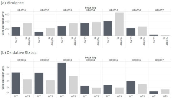Evidence of expression of genes for Helicobacter pylori universal stress protein (HP0031) and ATP-dependent Clp protease adapter protein ClpS (HP0032) and other neighboring genes. (a) Gene expression of wild type strain (Su wt) and strain deficient in the cytotoxic-associated gene-pathogenicity island (Su ∆cagPAI). Helicobacter pylori Su isolate is from Northeast Africa, Sudan population []. (b) Gene expression of wild type strain (WT, incubated with 2% oxygen) and strain (WTS, incubated with 21% oxygen). (1) HP0033: ATP-dependent Clp protease ATP-binding subunit ClpA; (2) HP0034: L-aspartate 1-decarboxylase; (3) HP0035: nucleoid-associated protein EbfC; (4) HP0036: PDZ domain protein; (5) HP0037: ComB6 competence protein.