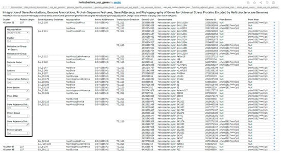 A section of an image from the web resource for interacting with the dataset composed of values for annotations of universal stress protein sequences encoded by Helicobacter pylori genomes with assigned population. The categories of annotations in the visual are (1) Gene Annotations (Gene ID USP); Genome Annotations (Genome ID, Genome Name, Helicobacter Group, Species, and Strain Group); Protein Sequence Features (amino Acid Pattern, Cluster, and Protein Length), Gene Adjacency (Gene Adjacency Distances, Pfam Before, Pfam After, and Transcription Direction); and Phylogeography of H. pylori isolates (Hp population). The insert rectangle shows filters that can be modified to change the list of genes displayed. The population ancestry was obtained from The Helicobacter pylori Genome Project []. We obtained the additional annotations from the Integrated Microbial Genomes/Microbiomes (IMG/M) system or derived them with bioinformatics/visual analytics procedures.