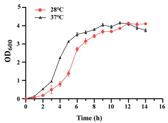 Growth curves of C. sakazakii WT strain at 28 °C and 37 °C. Overnight culture was diluted 100-fold into fresh LB medium with aeration. The bacteria’s optical density (OD) was detected at 600 nm every hour. Error bars represent standard deviations, n = 3.