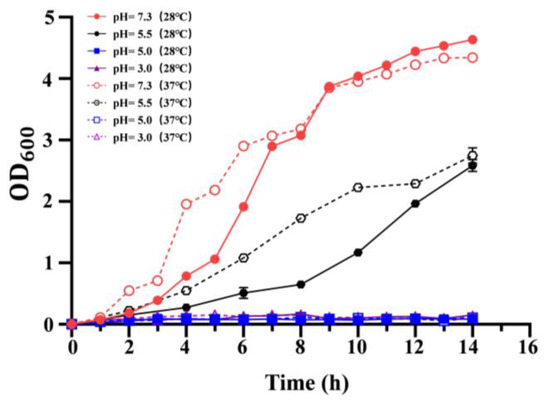 The pH of the medium was adjusted so that the initial pH was pH 7.3, pH 6.0, pH 5.0, pH 5.5, or pH 3.0. The target strains cultured overnight were diluted at a ratio of 1:100, and then cultured at 37 °C or 28 °C. OD600 was measured every 2 h to plot acid-resistant growth curves, which was repeated three times for each sample.