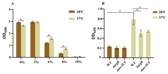 The NaCl resistance of C. sakazakii WT at 28 °C and 37 °C. (A) WT strains were transferred to LB with different NaCl concentrations (0%, 3%, 6%, 8%, 10%) and cultured for 12 h; (B) WT, ΔargR and ΔarcACF strains were transferred to LB with 8% NaCl concentration and cultured for 12 h. Error bars represent standard deviations, n = 3. A representative of three independent experiments with the same results is shown. The data shown are means ± standard errors of the means. * p < 0.05 by Student’s t test.