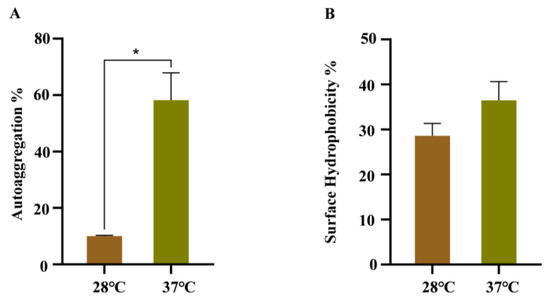 Autoaggregation and cell surface hydrophobicity of WT strains at 28 °C and 37 °C. (A) Autoaggregation; (B) cell surface hydrophobicity. Error bars represent standard deviations, n = 3. A representative of three independent experiments with the same results is shown. The data shown are means ± standard errors of the means. * p < 0.05 by Student’s t test.