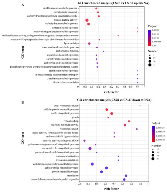 GO enrichment analysis of differentially expressed genes. Compared with WT strain growing at 28 °C, the expression level of strain growing at 37 °C was significantly up-regulated (A) and significantly down-regulated (B).