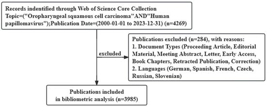 The publications for this study were searched and screened on the Web of Science Core Collection (WoSCC), one of the most authoritative databases that contains more than 12,000 top-quality journals and comprehensive data for bibliometric studies [24]. The data needed for this study were retrieved from WoSCC and exported in plain text file format with full records and cited references. The search strategy was “Topic = (Oropharyngeal squamous cell carcinoma AND Human papillomavirus”, and the time span was from 1 January 2000, to 31 December 2023. The document types were limited to articles and review articles, and publications not written in English were excluded. Article includes research papers, brief communications, technical notes, chronologies, full papers, and case reports (presented like full papers) that were published in a journal and/or presented at a symposium or conference. Ultimately, a total of 3985 publications (3347 articles and 638 review articles) were included in the study (Figure 1). The included studies included human studies and preclinical studies.