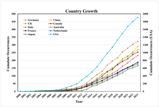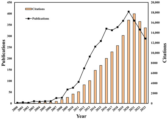 Microsoft Office Excel 2021 was used for data organization and statistical table creation in this study. The software VOSviewer 1.6.20, CiteSpace 6.3.R1, and the R package Bibliometrix 4.0.0 are powerful tools for processing and visualizing bibliometric data, each with its own adept analysis scope [25,26,27]. VOSviewer 1.6.20 was employed for keyword co-occurrence plot analysis and co-authorship analysis, which refers to investigating the relatedness of items determined by their number of co-authored documents, involving authors, organizations, and countries. It is also utilized in the citation analysis of publications. CiteSpace 6.3.R1 was used in the dual-map of journal analysis as well as citation bursts analysis of keywords, whereas the R package Bibliometrix 4.0.0 was used to visualize keyword distributions.